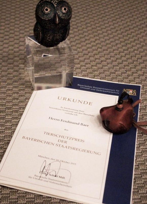 Den Tierschutzpreis der Bayerischen Staatsregierung erhielt in diesem Jahr der stellvertretende Vorsitzende des Deutschen Falkenorden e.V., Ferdinand Baer, der seit seinem 14. Lebensjahr Falkner ist. Er ist ehrenamtlicher Leiter der LBV-Pflegestation Regenstauf und wurde für sein Engagement im aktiven Greifvogelschutz ausgezeichnet.