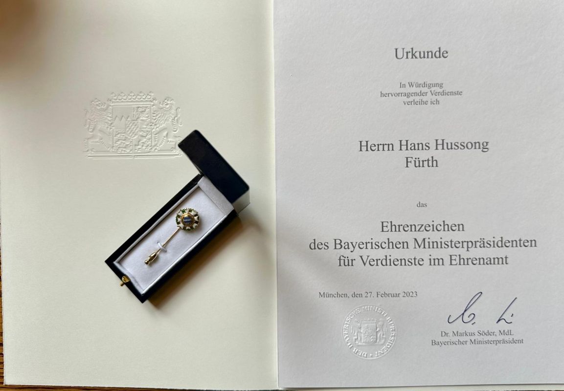 Am 6. November 2023 wurde Hans-Kurt Hussong im Rathaus Fürth vom Oberbürgermeister der Stadt Fürth, Dr. Thomas Jung, das Ehrenzeichen des Bayerischen Ministerpräsidenten, Dr. Markus Söder, für Verdienste im Ehrenamt verliehen.